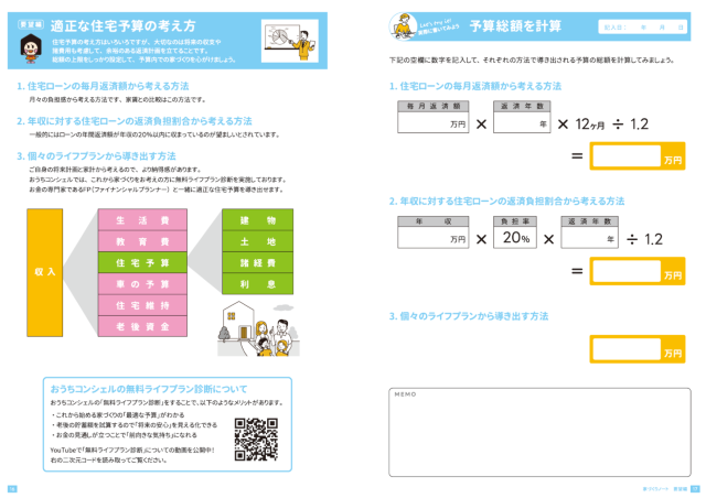 上の写真(家づくりノート)の17ページにある2つの式(①毎月返済額から、②年収と負担率から)は、ライフプラン方式で算出した「毎月返済の上限」や家計の安全域を確認するためのクロスチェックに使うのが理想です。式だけで金額を決めず、ライフプランで導いた値が式の結果を上回っていないかを確認しましょう。