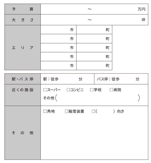 おうちコンシェルの家づくりノートには、土地探しの方向性を整理できる「土地の条件整理シート」も掲載しています。